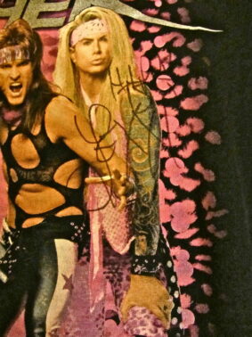 Danach trafen wir uns noch mit den Steel Panther Jungs, damit ich meine CD-Booklets unterschreiben lassen und das Foto mit Lexxi nachholen konnte, das in Frankfurt von meinem iPhone 4 mächtig verkackt wurde. Da es auch praktischerweise gerade nach 0 Uhr war, bekam ich von Lexxi noch zum Geburtstag gratuliert und sein Geburtstagsautogramm wurde auf meinem Shirt verewigt – auch wenn er der Meinung war, dass es da drauf nicht lange hält. Wir werden sehen…