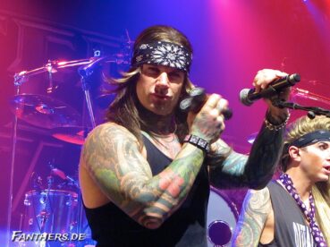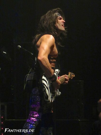 Ich stand an der gleichen Stelle wie im März und war eigentlich glücklich damit, denn was in Paris im Moshpit abgeht während einem Konzert, ist schon wirklich verrückt. Sobald ein Mädel seine Titten entblößt, fangen die männlichen Konzertbesucher an, hektisch danach zu greifen. Da war es ganz gut, eher an der Seite zu stehen – obwohl es da auch nicht immer harmlos zuging. Nachdem die Fotografen aus dem Fotopit (der mal wieder echt voll war) verschwunden waren, wurden wir erstmal von der Band mittels Winken, Grinsen und Zwinkern begrüßt 🙂 Und auch wenn ich mal wieder nur die kleine Kompaktkamera dabei hatte, legten sich die Jungs ganz schön für mich ins Zeug. So zum Beispiel Lexxi und Stix. Bei Lexxi wollte allerdings der etwas langsame Autofokus der Knipse nicht und das Foto war für die Tonne. Auch wenn er nett nachfragte, ob das Foto was geworden ist: Ich wollte ihn sicher nicht mit dem Foto aufhalten, also musste es so passen – das kam übrigens dabei raus. Nichts, womit man angeben kann, aber ich mag es dennoch 😉
